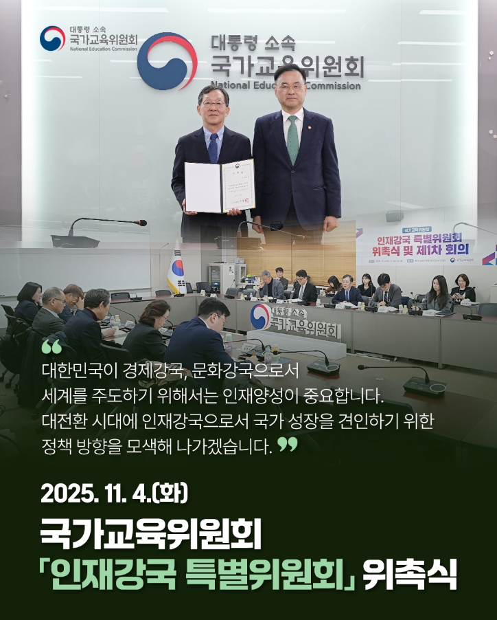 2025년 11월 4일, 국가교육위원회 「인재강국 특별위원회」 위촉식을 개최하였습니다. 대전환 시대에 인재강국으로서 국가 성장을 견인하기 위한 정책 방향을 모색해 나가겠습니다.