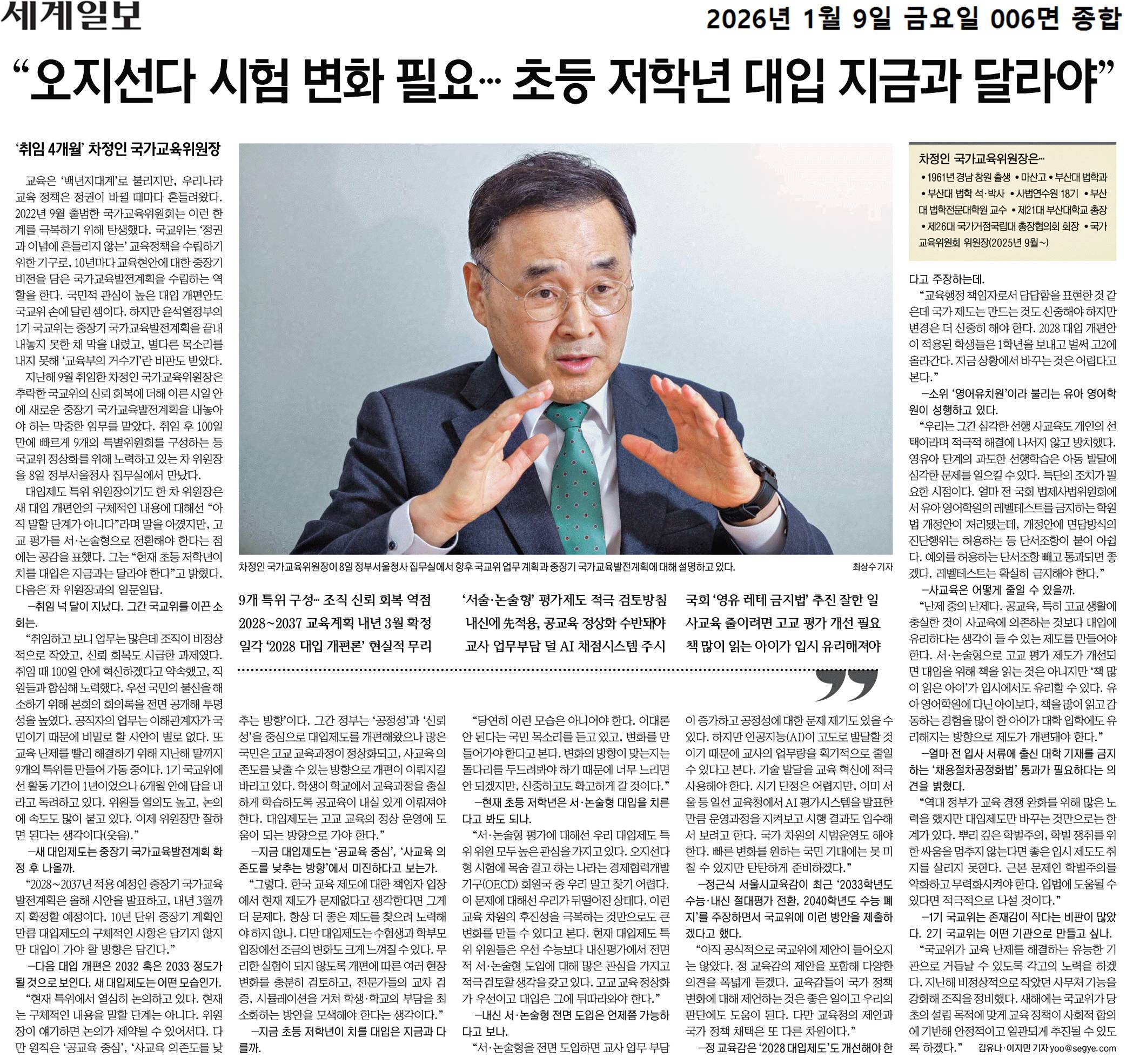 ▶ 언론사: 세계일보 ▶ 보도: 2026. 1. 9. ▶ 취재: 김유나 사회부차장, 이지민 교육기자 ▶ 내용: 2026년 국가교육위원회 업무 추진 방향